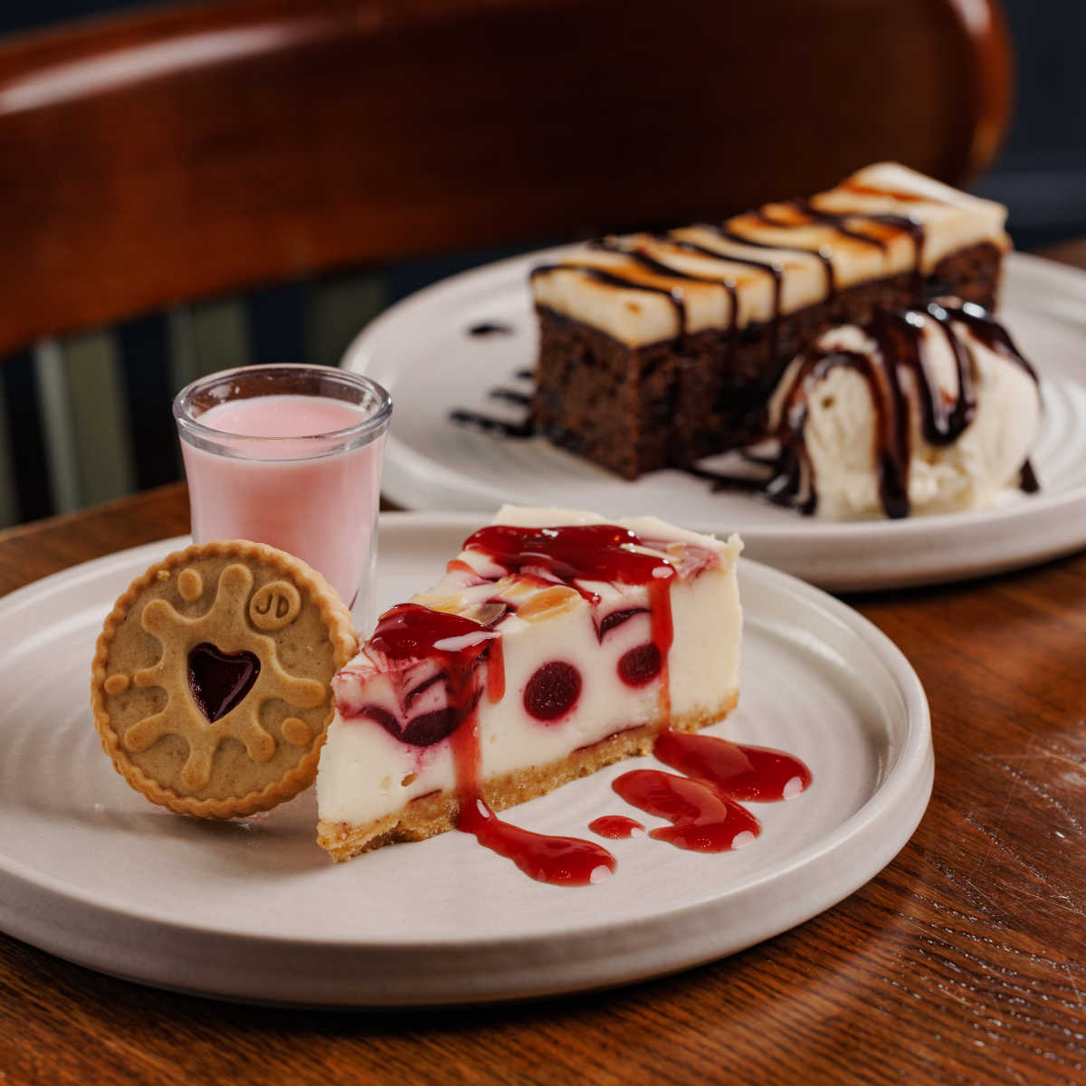 Jammie dodger cheesecake, raspberry & cherry cheesecake topped with almonds, with a boozy raspberry shot on the side (contains alcohol) (v) | 6.99 601 kcals